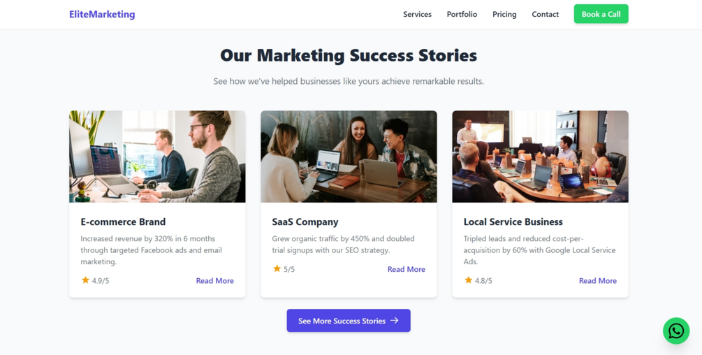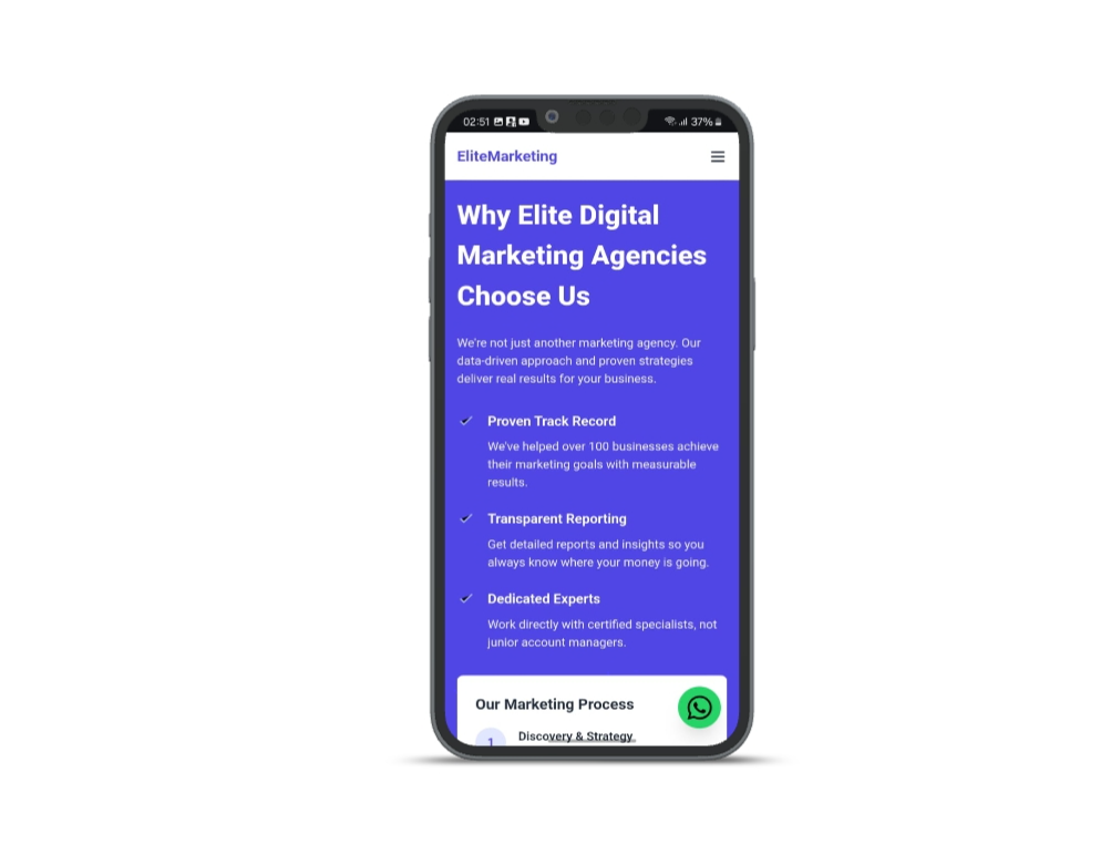 EliteMarketing - is a modern, high-performance booking-ready website template for digital marketing agencies, SEO firms, and creative studios. Built with HTML, Tailwind CSS, and Vanilla JavaScript, this sleek template is crafted to convert visitors into clients with powerful CTAs, WhatsApp integration, and a live map. Perfect for agencies offering SEO, content strategy, social media, or full-service marketing — all without a single line of backend code.