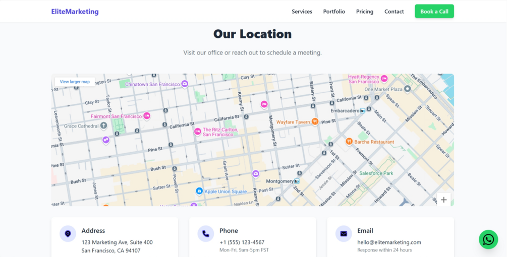 WhatsApp Chat, Booking Form, Google Maps