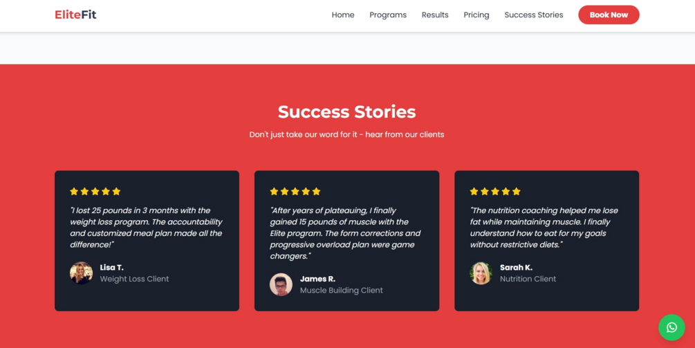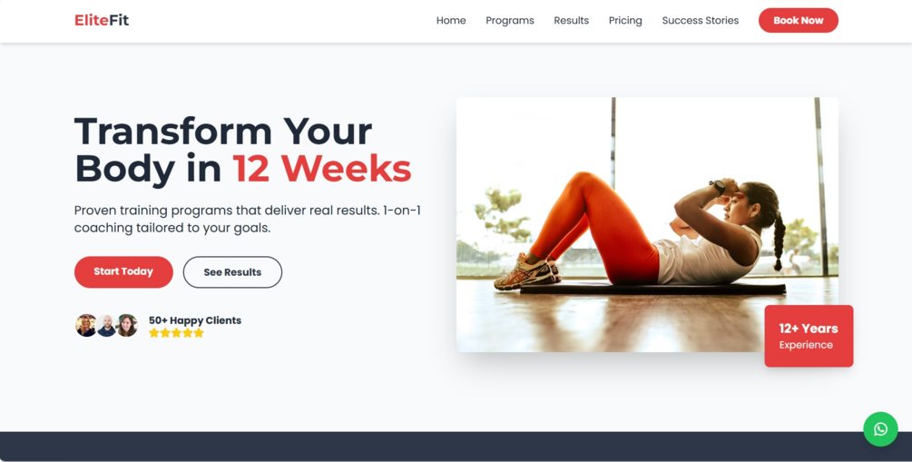 A powerful, scroll-triggered website template built to attract fitness clients and boost gym memberships with sleek design and WhatsApp booking.