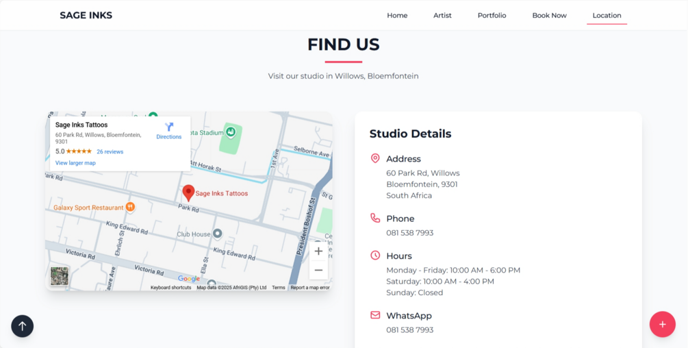 A sleek, modern booking website crafted for tattoo studios and creatives β€” built with HTML, Tailwind CSS & Vanilla JS. Seamlessly integrates WhatsApp scheduling, live location mapping, and fast performance β€” , no fluff.